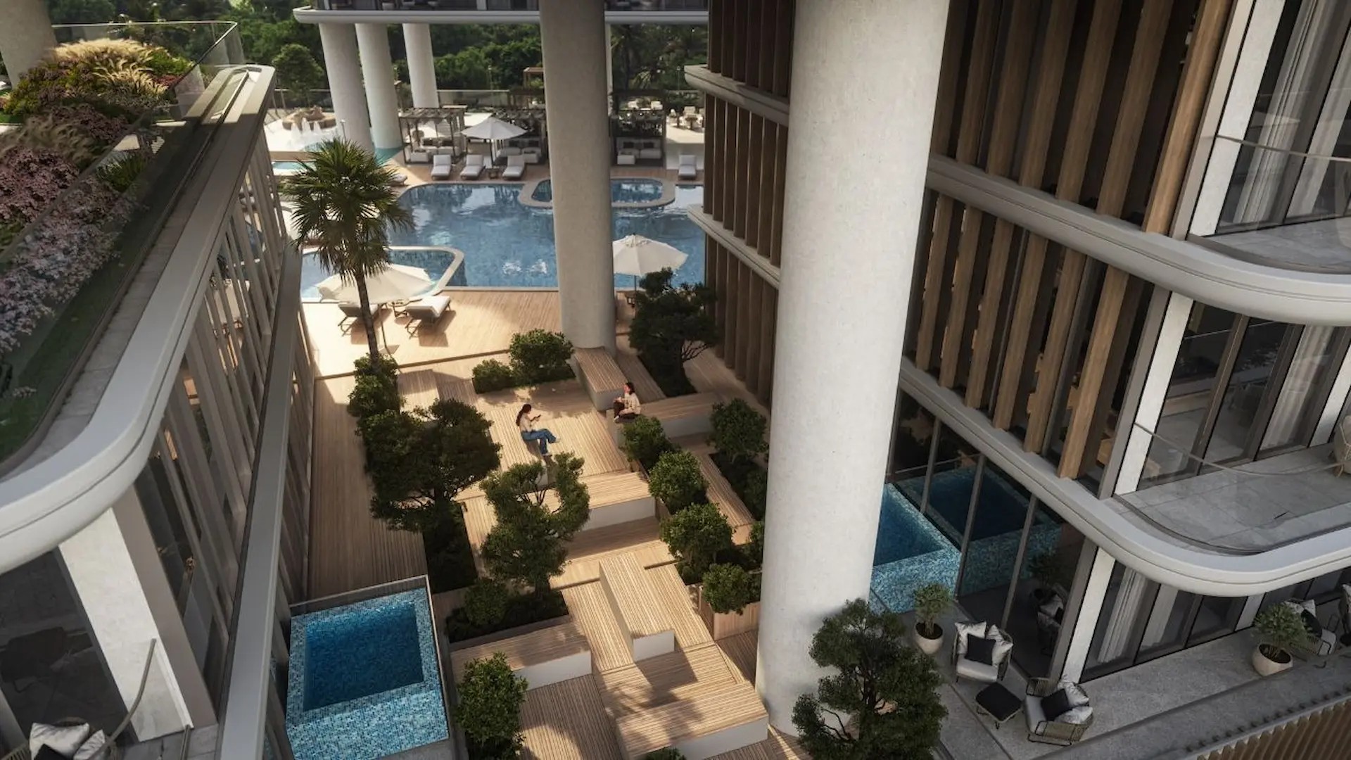 Resort-style amenities including infinity pool, Jacuzzi, wellness zones, and sunlit decks.